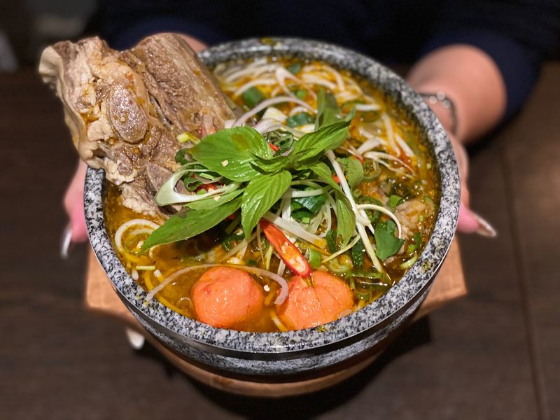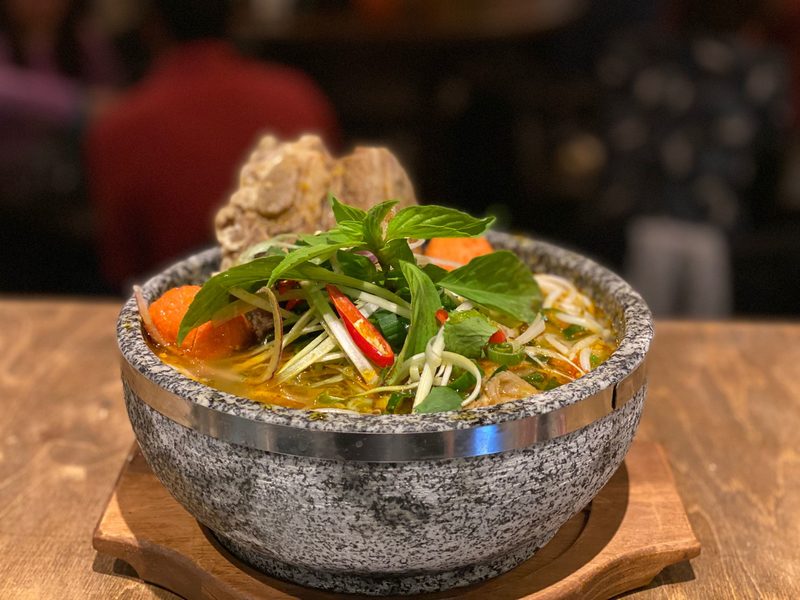 Traditionelle Rindfleischbrühe mit Reisbandnudeln, zartem Rindfleisch, Rinderrippe, Rinderschwanz, Zwiebeln und Koriander.